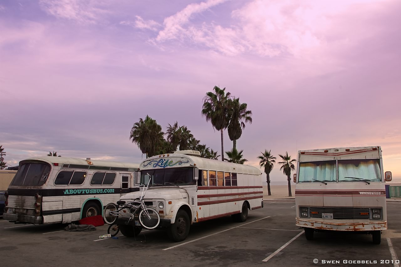Bei diesem L.A. Trip haben wir uns dann auch ein paar Wohngegenden angesehen; die Busse hier hatten auf jeden Fall eine Super-Strandlage!!! Venice war auf jeden Fall schon verrückt – das darf demnächst in keinem Reiseprogramm mehr fehlen. Wir haben noch nie soviele Freaks auf einmal gesehen …