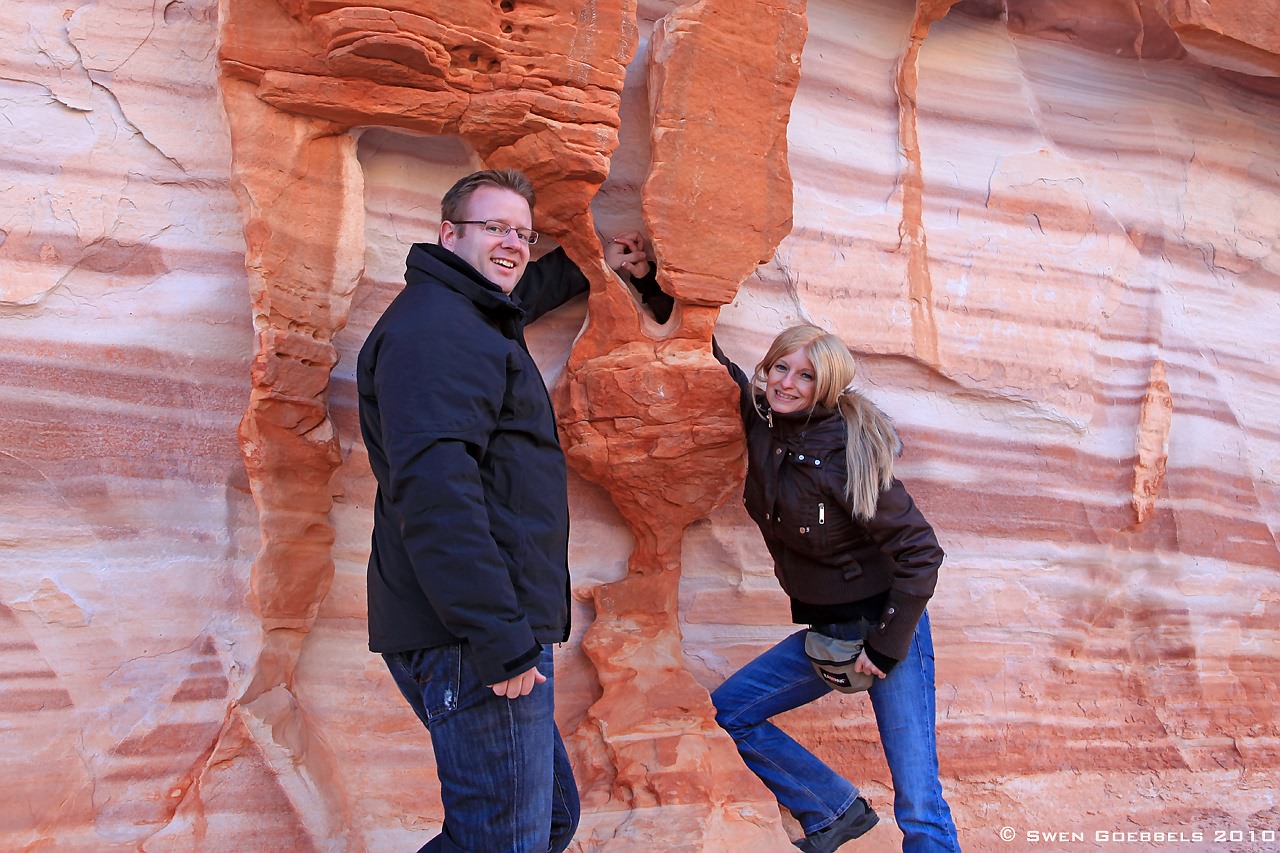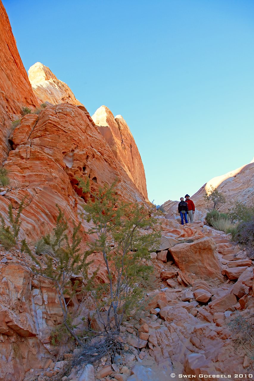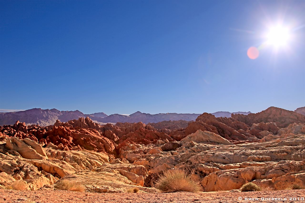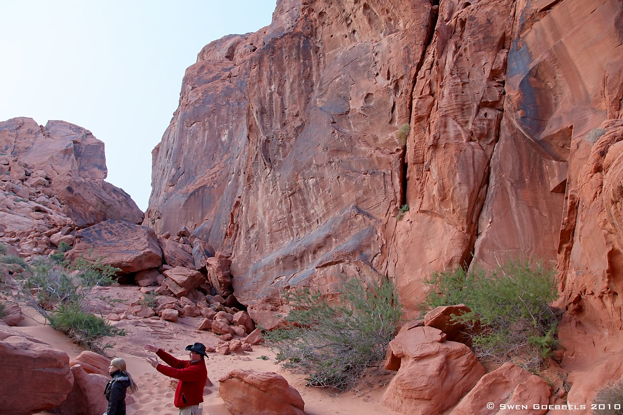 Heute ist Bernhard wieder von Las Vegas nach Hause geflogen. Schade! Aber vorher hat er uns noch einige schöne Tage und gute Essen beschert! So zum Beispiel gestern. Zunächst sind wir mittags ins Valley of Fire gefahren. Rein theoretisch sind Swen und ich schon einige Male dort gewesen, hatten aber nie sonderlich viel Zeit. Diese Zeit haben wir uns gestern genommen und sind an einigen uns bisher völlig unbekannten Aussichtspunkten ausgestiegen und rumgeklettert. Besonders erwähnenswert war dabei ein ca. 2 km langer Rundweg am Ende einer landschaftlich wundervollen Stichstraße (White Domes).