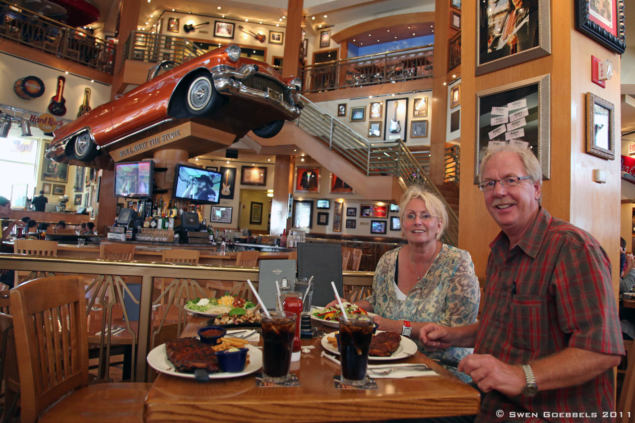 Die Studiotour führte uns über das Gelände, zeigte die großen Innenfilmsets in Lagerhallen sowie die Außenkulissen. Besonderes Highlight war die neu gebaute 360 Grad 3D Kinohalle, die komplett um einen herum King Kong in Action zeigte. Leider hat Elfriede nur den Anfang des spektakulären Films gesehen, da sie dann vor lauter Schreck die Augen geschlossen hatte und an Haralds Schulter klebte. Dann haben wir uns die meisten großen Shows angesehen, wie beispielsweise Water World, Terminator 3D sowie Shrek 4D. Schöner Abschluß war mal wieder ein gutes Essen im Hard Rock Cafe Hollywood!