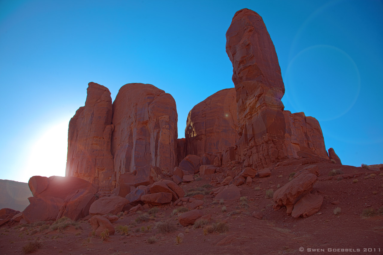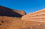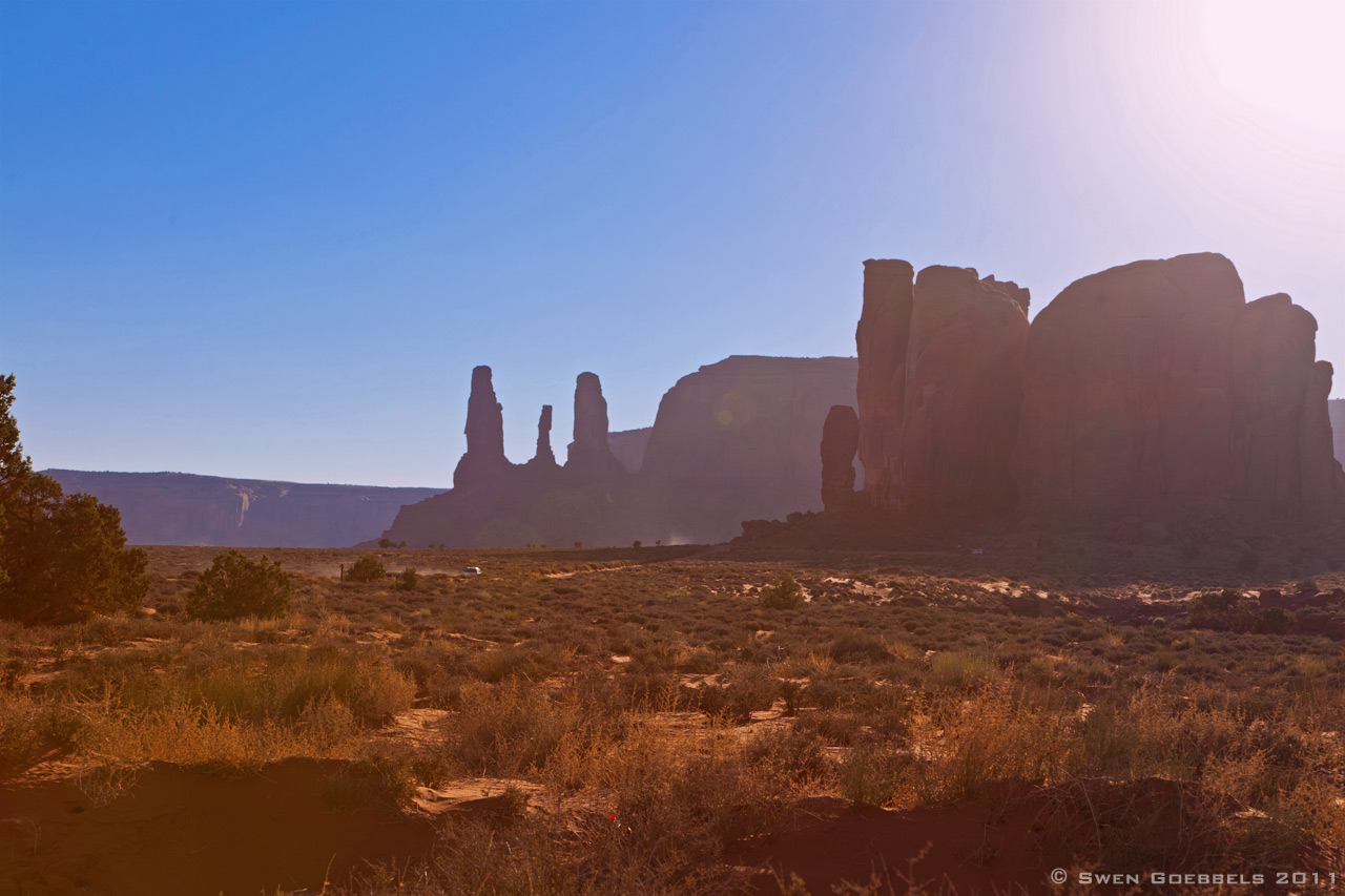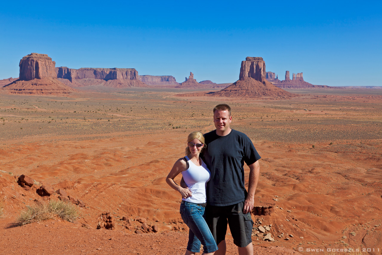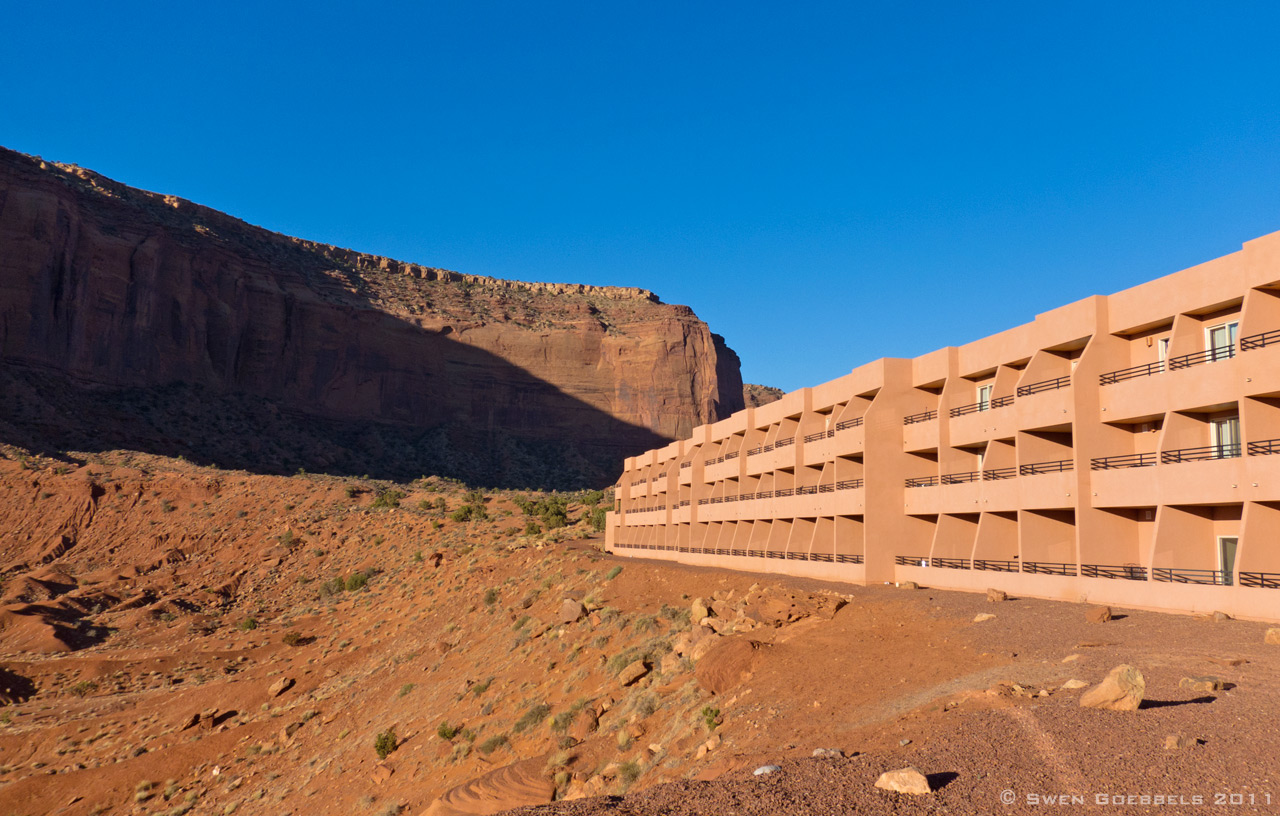 Weiter ging es dann zum Monument Valley, wobei das Thermometer mittlerweile wieder auf 38°C kletterte. Wir hatten uns im Hotel “The View” einquartiert und tatsächlich gab es sonst auch weit und breit NICHTS (außer Felsen). Auch hier wohnten früher die Anasazi (also nicht im Hotel, sondern im Monument Valley), bauten vor ca. 1500 Jahren Felsbehausungen und verschwanden dann plötzlich im 13. Jahrhundert. Heute liegt das Monument Valley im Gebiet der Navajo Nation (Navajo-Indianer-Reservation) und diente vielen Filmen als Kulisse wie z.B.