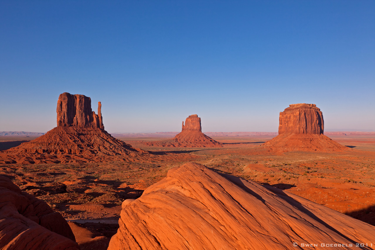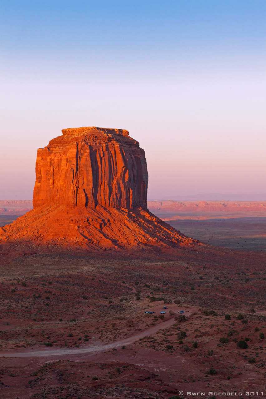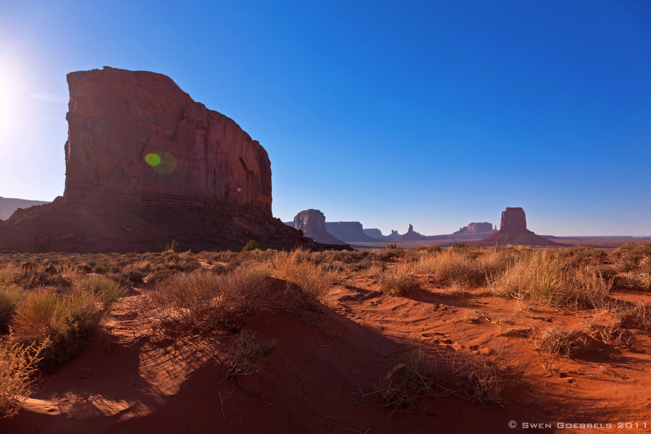 Weiter ging es dann zum Monument Valley, wobei das Thermometer mittlerweile wieder auf 38°C kletterte. Wir hatten uns im Hotel “The View” einquartiert und tatsächlich gab es sonst auch weit und breit NICHTS (außer Felsen). Auch hier wohnten früher die Anasazi (also nicht im Hotel, sondern im Monument Valley), bauten vor ca. 1500 Jahren Felsbehausungen und verschwanden dann plötzlich im 13. Jahrhundert. Heute liegt das Monument Valley im Gebiet der Navajo Nation (Navajo-Indianer-Reservation) und diente vielen Filmen als Kulisse wie z.B.