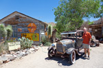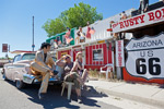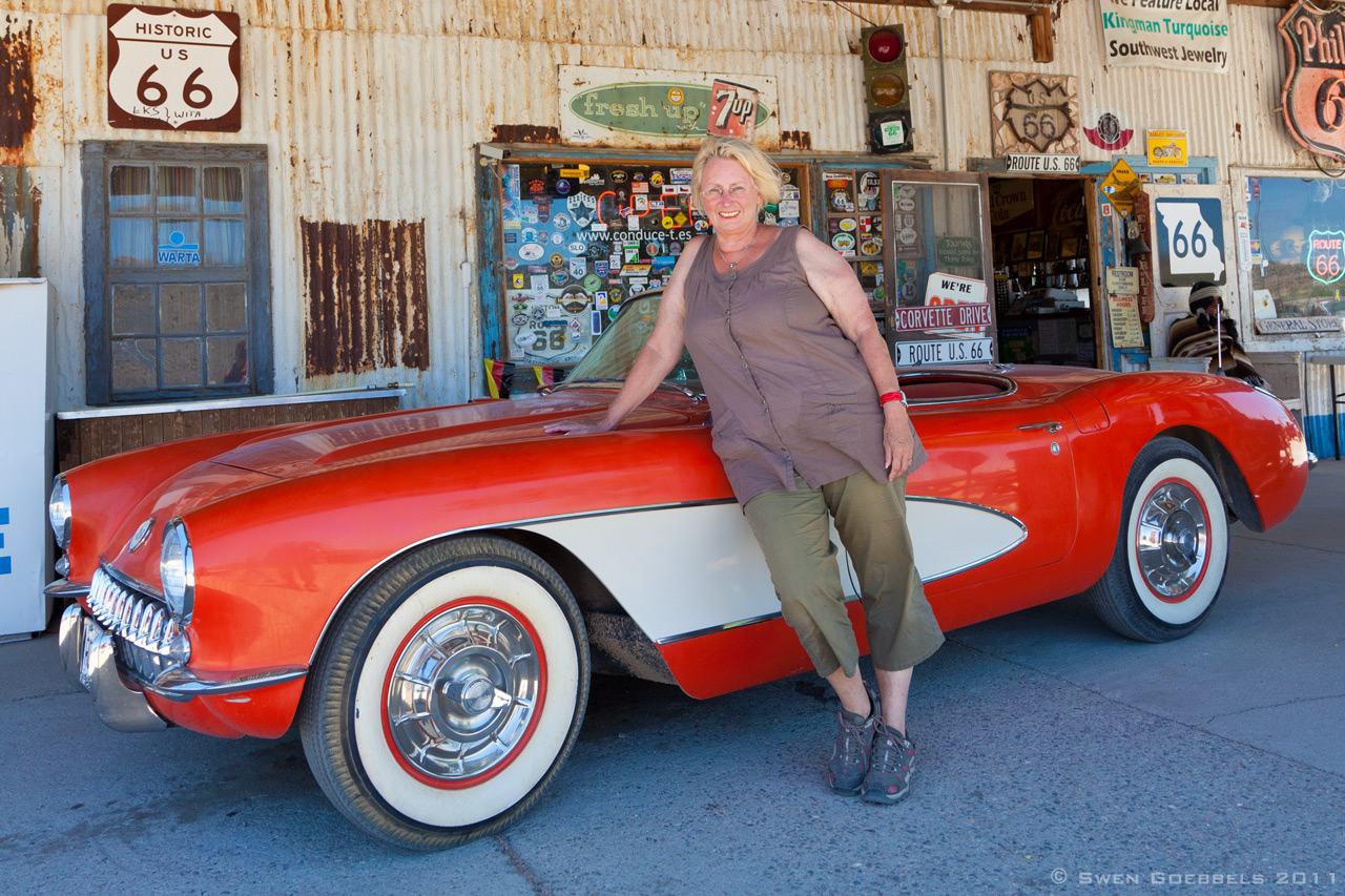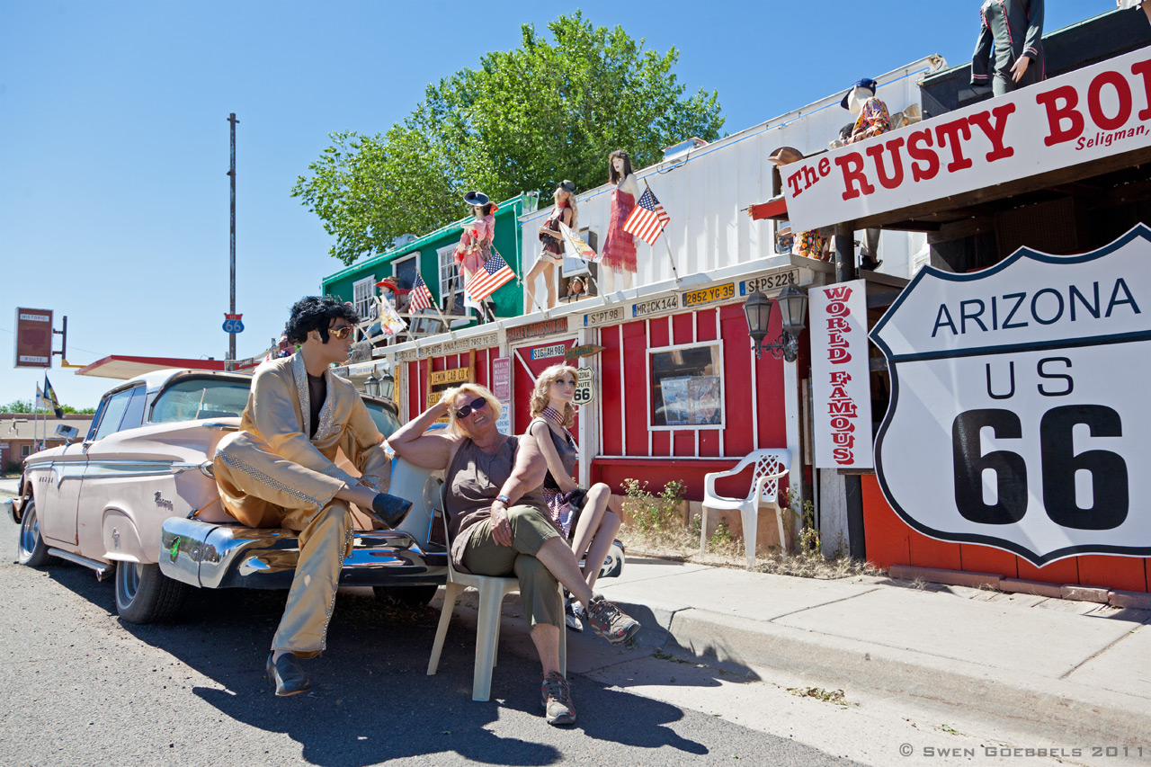 Wir haben die Nacht in Williams, Arizona verbracht und unser erster Abstecher des Tages bringt uns zur legendären Route 66. Um das echte Trucker-Feeling auf dieser alten Verbindungsstrecke von Ost nach West zu erleben, mußte Harald selber fahren. Heute ist die Route 66 kaum noch befahren. Es geht meistens schnurstracks gerade aus, man sieht zumindest auf diesem Stück kaum Orte und oft kein anderes Auto. Einige Überbleibsel auf der Route 66 haben wir uns entlang der Strecke angesehen, wie beispielsweise das kleine Örtchen Seligman und eine alte Tankstelle, die heute nur noch Touri-Stopp ist. Dazu gab es den ganzen Tag ausreichend amerikanisches und mexikanisches Fast-Food (McDonalds und El Pollo Loco).![]()