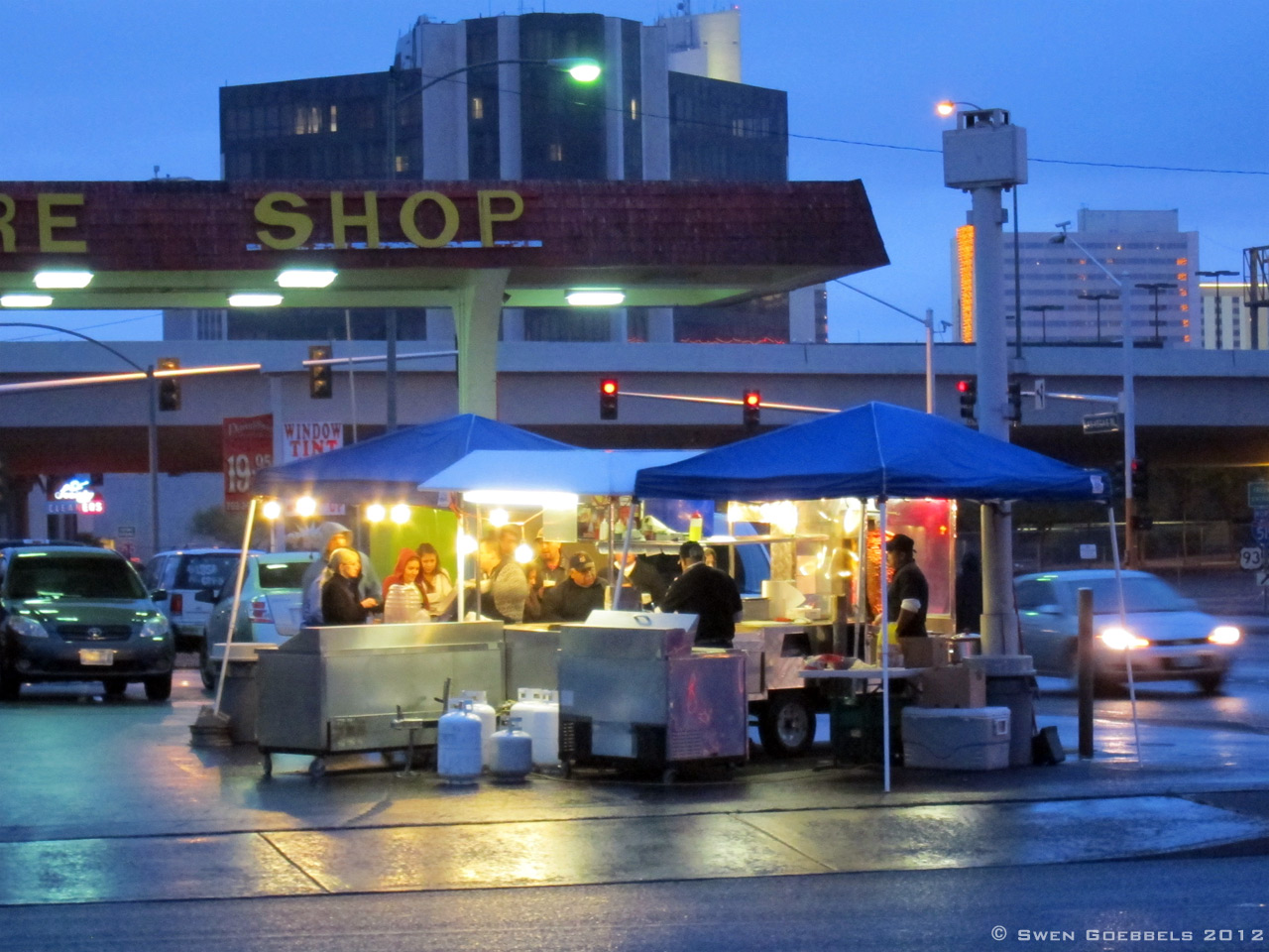 Dieses Jahr lernen wir Las Vegas auch noch einmal aus einer anderen Perspektive kennen – viel mehr aus der Sicht von „Einheimischen“ als aus der Touri-Perspektive … Experimentierfreudig wie wir derzeit sind, probieren wir beispielsweise neue Restaurants: an einem regnerischen Abend in Downtown (ja Regen gibt es hier ab und zu auch mal – ist aber schon was her) hat uns zum Beispiel diese kleine mexikanische „Fressbude“ an der Ecke angelacht. So etwas nennt sich „Taqueria“ und die hatten dort so etwas wie einen