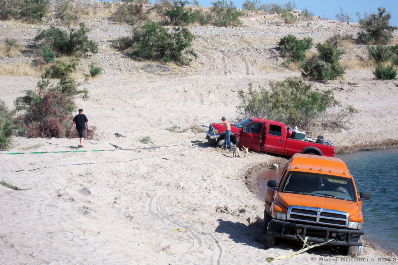 Eines schönen Tages im April haben wir uns dann auch noch einmal den Lake Mead angesehen (oder wollten zumindest), aber direkt bei Ankunft sind wir über unsere „Nachbarn“ aus Nord Las Vegas gestolpert, die es über das Wochenende geschafft haben 2 von 3 Pickup-Trucks am See festzufahren. Och nee, wirklich? Mit dem 3. Auto waren dann einige Hilfe holen, während wir in der Zwischenzeit versucht haben, den netten Opi aus dem Schlamm zu ziehen (also seinen Truck). Doch zum einen ist uns dabei unsere Seilwinde kaputt gegangen und zum anderen war es einfach zu heiß … sollen doch ausnahmsweise mal die anderen buddeln haben wir uns dann gedacht und sind stattdessen einfach mal zum Hafen gefahren, um uns Fische anzuschauen …