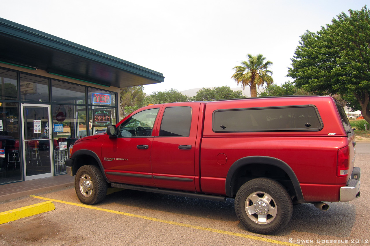Dienstagabend haben wir dann wieder in unserem bereits bewährten Super8 Motel in Alamogordo eingecheckt, damit wir am Mittwochmittag rechtzeitig und ohne weitere Verzögerung unseres Zeitplans unser neues Hardtop in Empfang nehmen können! Wir hätten ehrlicherweise nicht damit gerechnet, dass die Lieferung auch tatsächlich pünktlich erfolgte – unseren Erfahrungen nach wäre aus „Mittag“ wenigstens „später Nachmittag“ geworden – wenn nicht sogar der nächste Tag. Doch der Händler hat uns sehr überrascht: das Hardtop war sogar noch früher fertig als erwartet! Und es sieht wirklich gut aus! Super! Wir sind hocherfreut. Nach noch einigem sehr nettem Smalltalk sind wir dann auch noch in die Pizzeria zum Lunch gefahren, die ebenfalls dem gleichen Besitzer gehört. Und siehe da: die Pizza und die Milch-Shakes waren ebenfalls hervorragend!!!