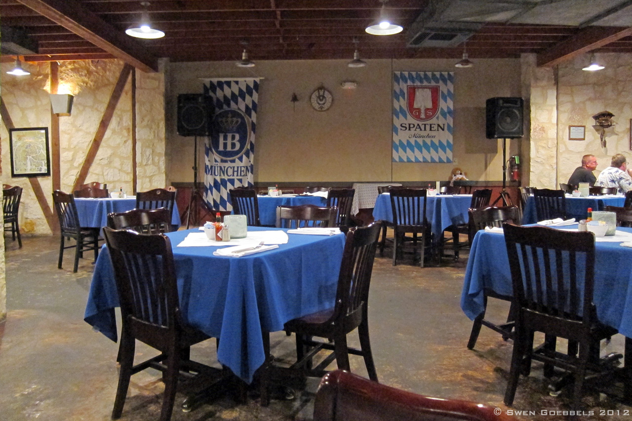 Das Capitol ist wirklich schön, die Stadt macht auch keinen schlechten Eindruck, aber wir sind froh, dass wir endlich wieder Land gewinnen; der Verkehr geht uns extrem auf die Nerven … Weiter geht’s dann Richtung San Antonio. Auf dem Weg dorthin kommen wir an New Braunfels vorbei. Ebenfalls einer Stadt mit deutschen Wurzeln und mittlerweile haben wir richtig Appetit bekommen und suchen uns also ein deutsches Restaurant (8. Bild von oben). Der deutsche Besitzer begrüßt uns , aber wir “outen” uns zu spät; in der Zwischenzeit sitzt dieser bei anderen Deutschen am Tisch und schwatzt ein wenig. Obwohl das Restaurant „Friesenhaus“ heißt, haben sie alles bayrisch weiß-blau gestaltet, auch die Musik. Die Speisekarte dagegen ist kunterbunt, von rheinischem Sauerbraten über Spätzle, Maultaschen, etc bis hin zu Bretzeln und Weißwurst. Vorab gibt’s selbstgebackenes Brot mit Frischkäse; Swen bestellt sich eine Wurstplatte, ich ein Jägerschnitzel. Die Speisekarte sagt ehrlicherweise, dass der Koch versucht, den deutschen Originalen so nah wie möglich zu kommen. Daher ist ihm mangelnde deutsche Perfektion verziehen. Swens Würste kommen natürlich nicht aus Deutschland, sind dafür aber gar nicht mal schlecht. Mein Essen ist gut für amerikanische Verhältnisse (für deutsche eher unterdurchschnittlich), aber wir hatten da beide richtig Lust zu. Mein Schnitzel war gut, Soße ebenfalls nicht schlecht auch das Rotkohl ging (wenn auch wirklich anders als in Deutschland). Dafür war eines aber 100%ig wie in Deutschland: die Preise! Saftig!!!