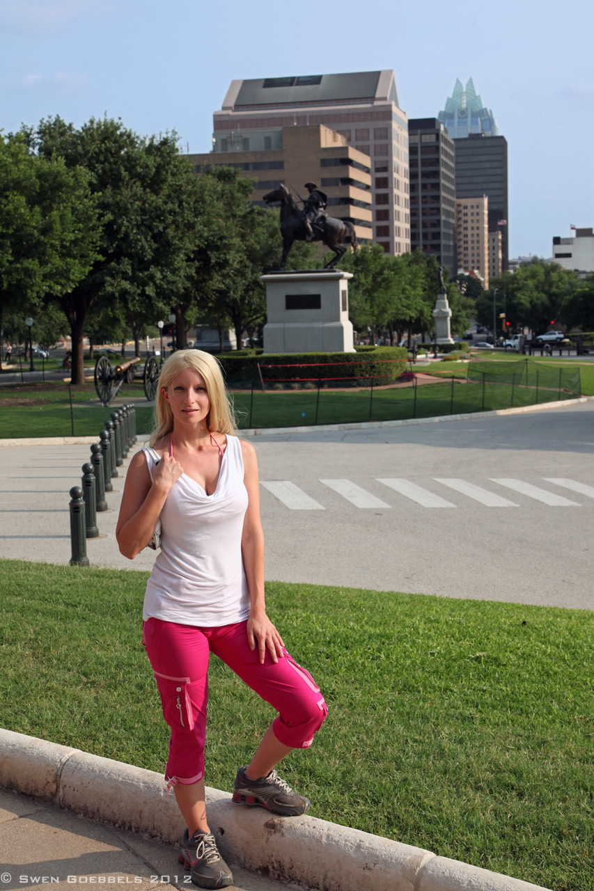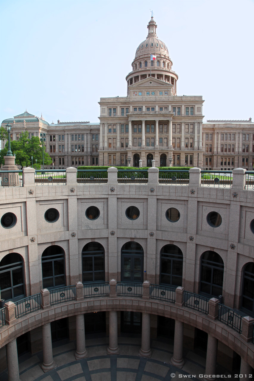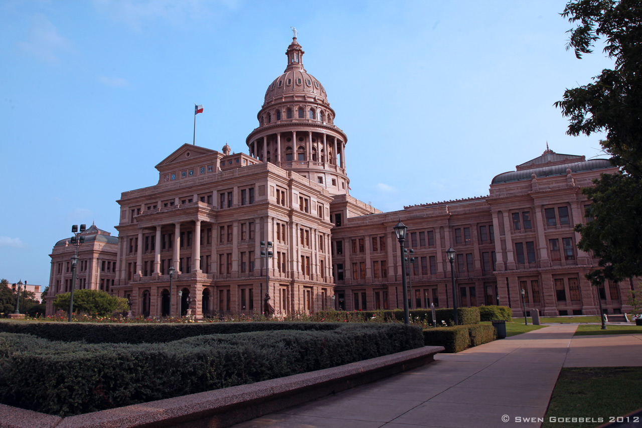 Mittags ging es dann weiter Richtung Küste und auf dem Weg dorthin durch Austin und San Antonio. Kurz vor Austin hatten wir dann unseren 1. Stau auf der ganzen bisherigen Reise. Und unser 1. Reisetag in Texas begrüßte uns mit den nun hier herrschenden Verkehrsregeln. Viel Verkehr, sehr unübersichtlich, völlig unlogische Straßenführungen, überall Videoüberwachung und Kontrollen. Wir erkundigen uns glücklicherweise vorher im Internet und erfahren, dass hier ein Rechtsabbiegen bei roter Ampel (wie sonst üblich in den USA) schon ein bißchen schwieriger wird. Es ist zwar immer noch erlaubt, wird aber dank Videokameras überall sehr viel strenger überwacht und wenn man nicht ordnungsgemäß stoppt oder nicht lange genug, dann gibt das schon ein saftiges Bußgeld. Ok, dann verzichten wir mal auf Rechtsabbiegen bei Rot in Texas … Neu sind auch die ganzen Einbahnstraßen. Hey, hier war doch mal genug Platz auf der grünen Wiese bevor die Riesenstadt auf dem Reißbrett gezeichnet wurde? Warum gibt es dann so viele doofe Einbahnstraßen? Der Verkehr in Austin ist nicht lustig. Wir finden glücklicherweise einen Parkplatz und schauen uns das Capitol an. Dies ist das größte Capitol in den ganzen USA. Nun ja, auch das lernen wir: in Texas ist eben alles immer größer!