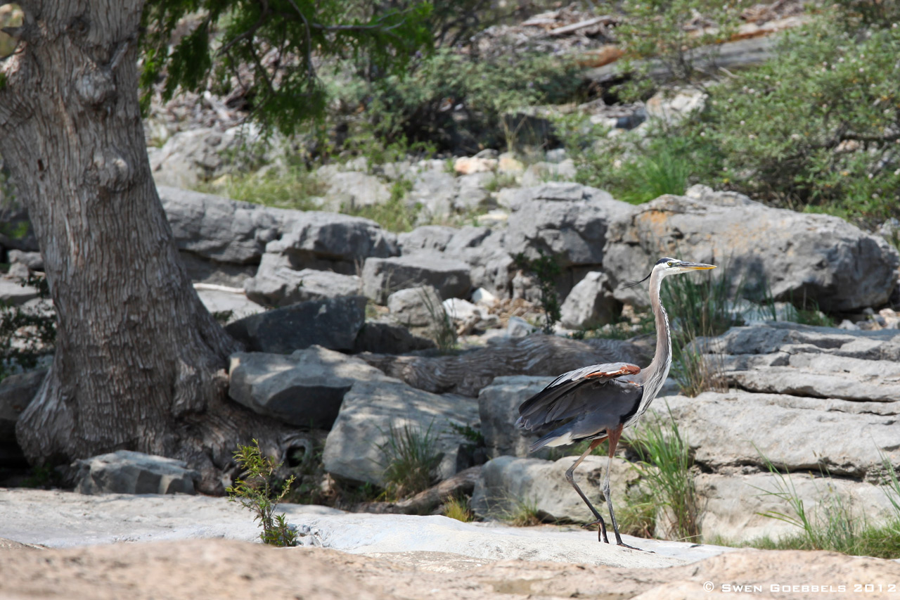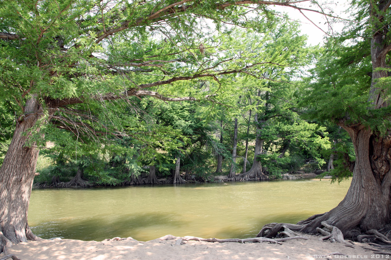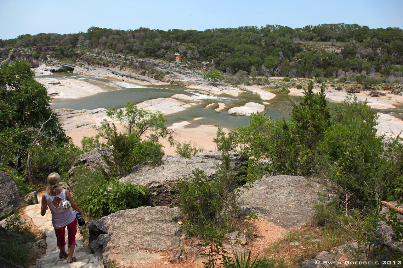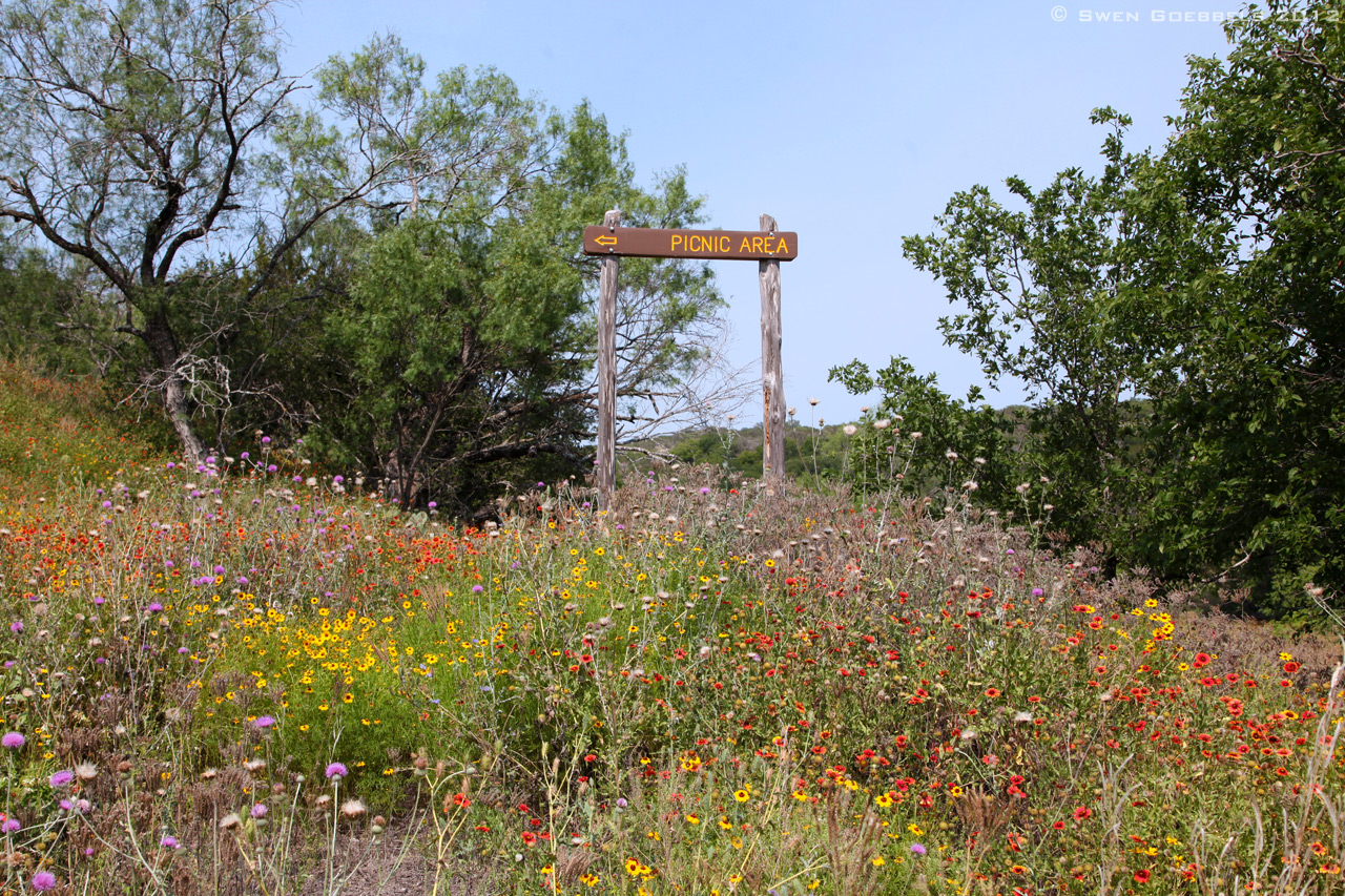 Hier noch einmal die Reiseroute des Tages. Zwischendurch besichtigten wir noch den “Pedernales Falls State Park”. Ich kann mich nicht mehr genau an die Temperatur erinnern, aber es muss etwas um die 30°C gewesen sein mit EXTREM hoher Luftfeuchtigkeit! Der Park war ideal zum Schwimmen mit einigen kleinen “Wasserfällen”, vielen schönen Badebuchten, bunten Blumenwiesen und schattigen großen Bäumen. Wir und einige Fischreiher haben Lachse beobachtet, die Stromschnellen hochsprangen, nur leider schwer zu fotografieren waren …